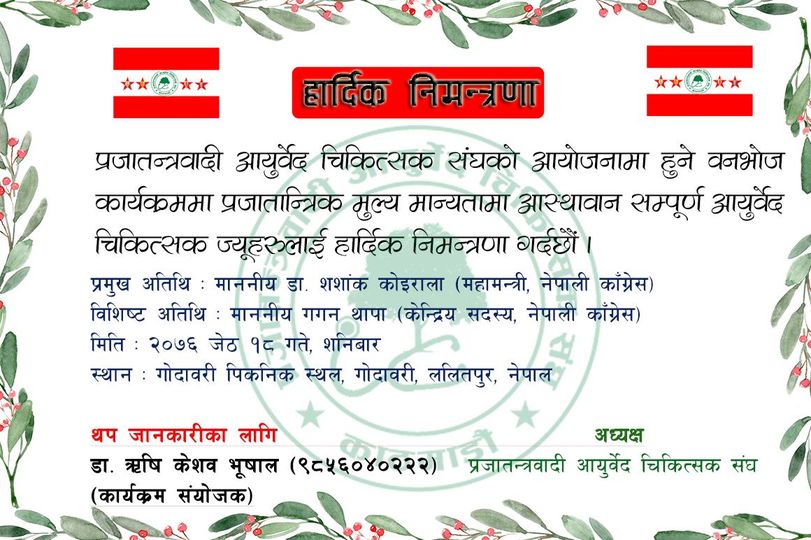 प्रजातन्त्रवादी आयुर्वेद चिकित्सक संघले आयोजना गरेको शुभकामना तथा चियापान कार्यक्रममा उपस्थित सम्पुर्णमा कार्यसमिती हृदयदेखि आभार प्रकट गर्दछौं ।